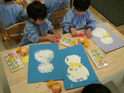 型にスタンプをしてみると、素敵な雪だるまが浮かび上がりました!