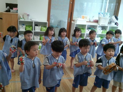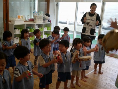 2歳児クラス今回は、カスタネット、タンブリン、鈴の3つの楽器を使って、楽器遊びをしました!