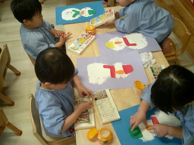 3歳児クラス今回の絵画は、「おに」です。絵の具をスポンジを使って赤鬼と青鬼を描きました。
