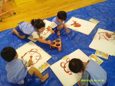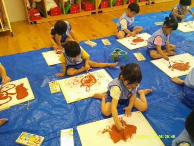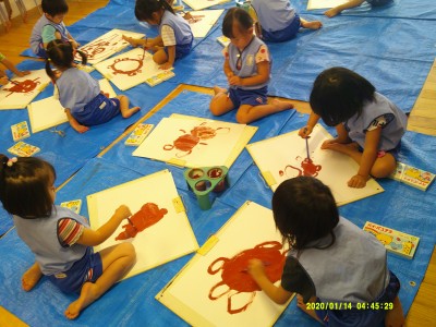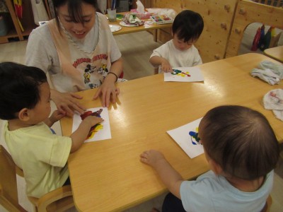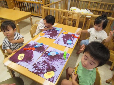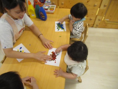 絵の具の感触に驚いて恐る恐るツンツンと触ったり、大胆に手のひら全体で色付けしたり…(#^^#)