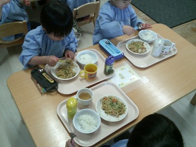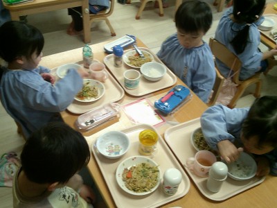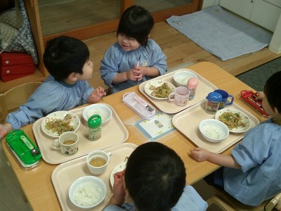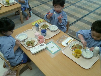 2歳児クラス2月からは、自分の給食セットを使って給食をいただきます!