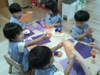 1歳児クラスハロウィン製作の続きをしました。昨日の製作は、かぼちゃ、こうもりにお顔を描きのりを使って貼ったよ(*^^*)上手に指を使ってのり付けできたよ!初めてののりの感触、どうだったかな?嫌がることなく楽しんでいる様子でした(*^^*)