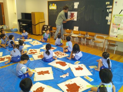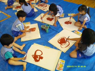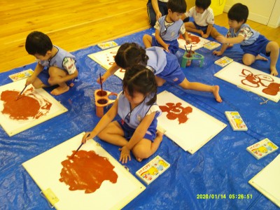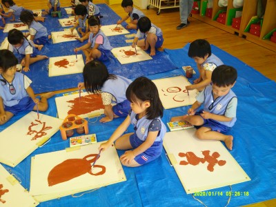3歳児クラス今月の絵画はクマさんの絵を描きました。筆で絵を描くことにも慣れて上手に描いていました!輪郭を描いたら中の色を塗って乾いたらクレパスで目や口、木や木の実を描き加えていきます。さあ!どんなくまさんが描けるかな?