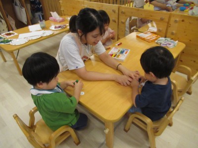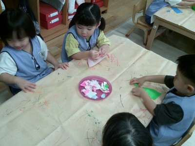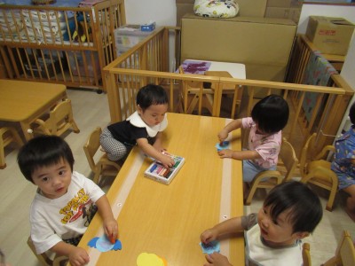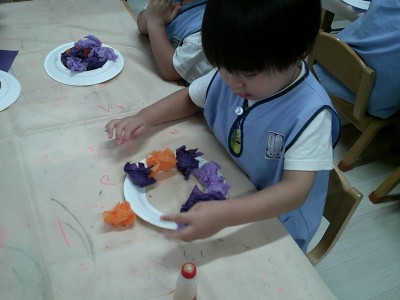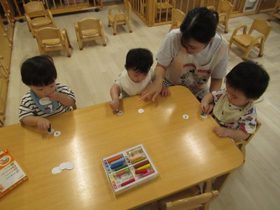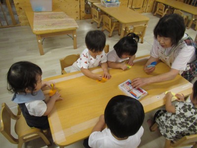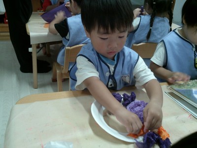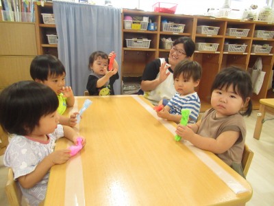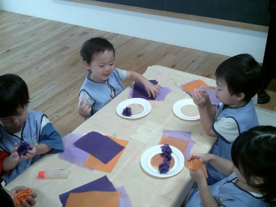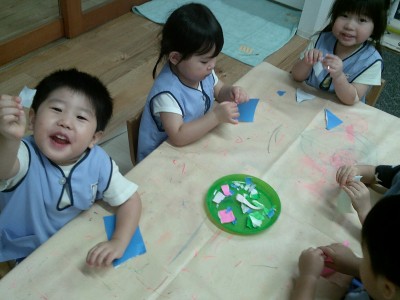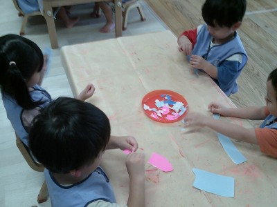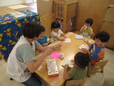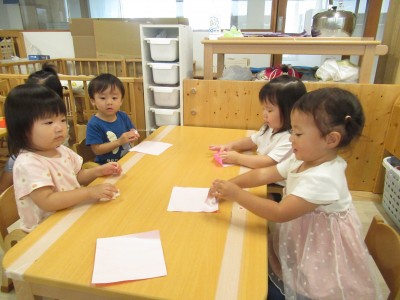 今日の製作は、折り紙を丸めてキャンディーを作ったよ!いろんな色のキャンディー、お友達と見せ合いっ子もしたよ!