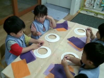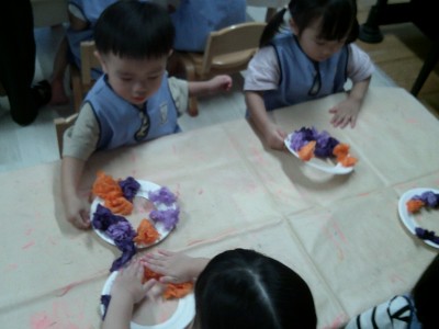 2歳児クラスハロウィン製作に向けて、リースを作りました!