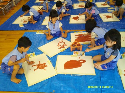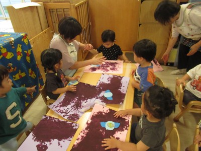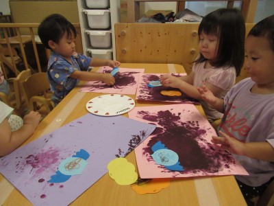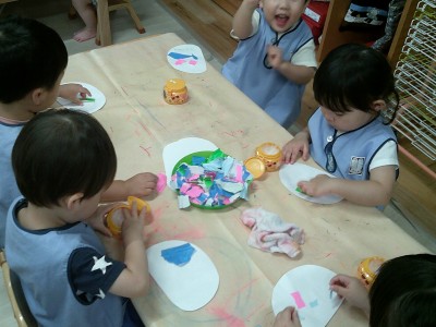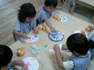2歳児クラス今回の製作では、きのこの傘を作りました!