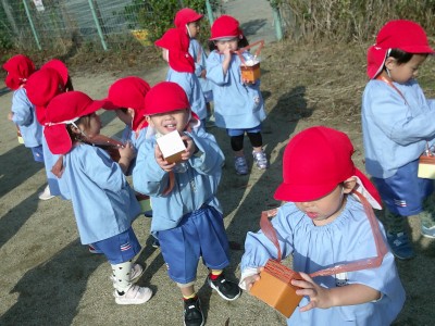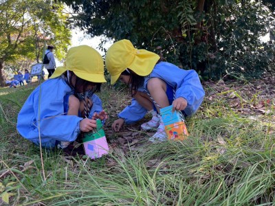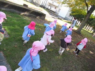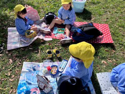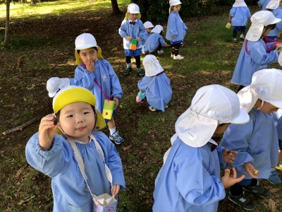 そして今日のメインイベント!お弁当の時間!!友達とシートを敷いておいしくいただきました(o^―^o)お弁当が終わるとみんなで「おにごっこ」や「だるまさんがころんだ」を楽しみました。そして、みんなでおさんぽ!またまた、どんぐり発見!