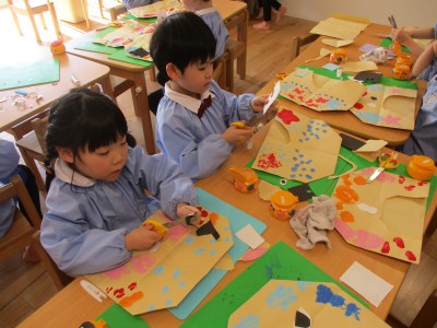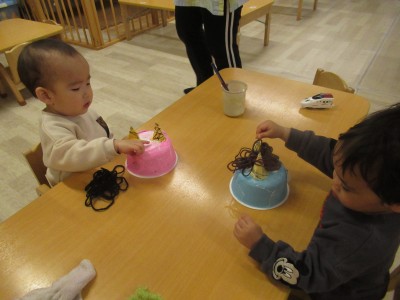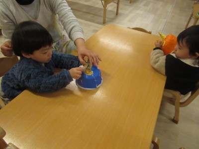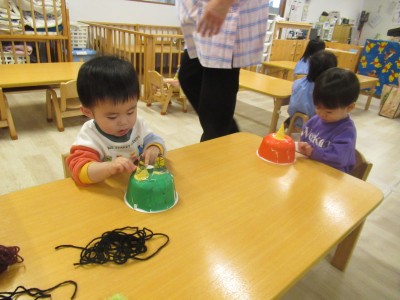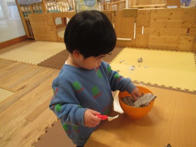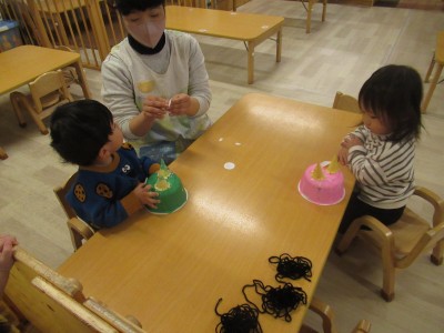 目の位置、ツノの本数、髪の毛の色すべて子どもたちで選び、個性のある鬼の帽子が完成しました(*^^*)