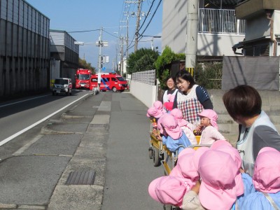 道路に出ると、なんと!消防車が走ってきました(>_<)みんな大興奮です!!!