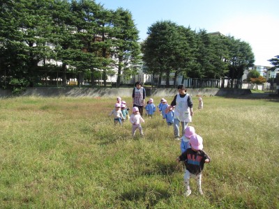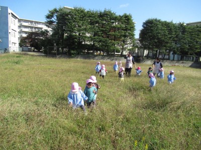 グランドは草がいっぱい!!草を踏み踏み歩いていくと、バッタやちょうちょうが飛んできてびっくり!