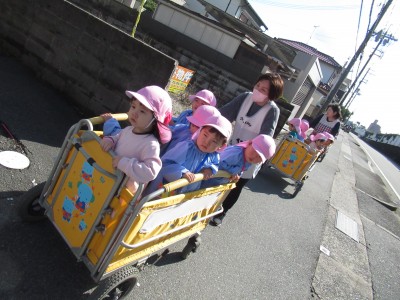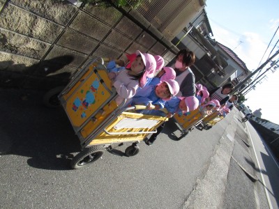 1歳児クラス今日は、とてもいいお天気!バギーに乗って園外散歩へ行ってきました!!