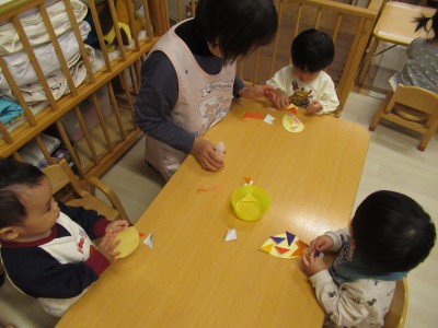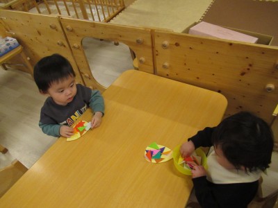 「びりびり~」「ぺたっ」と言いながら夢中になって製作を楽しんでいました(*^^*)