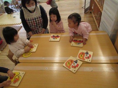 今回のコーナー遊びのメニューは・・・パズル遊び、磁石遊び、ポットン遊び、ひも通し