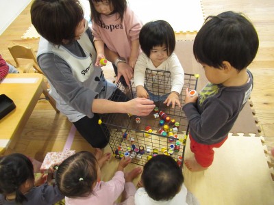 2歳児クラス好きな色を選んで、どんぐり転がしスタートです。