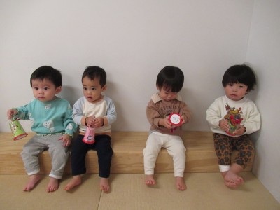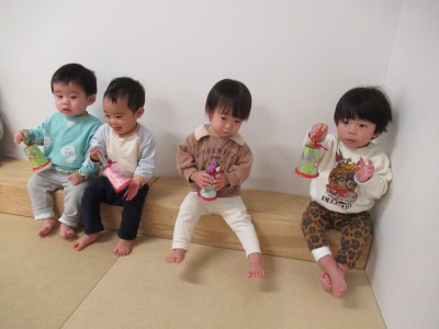 0歳児クラス先日手作り楽器を作ったあかつき組の子どもたち。