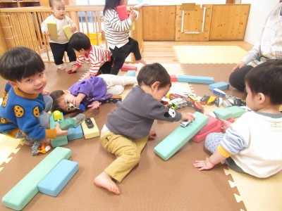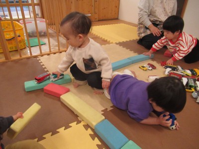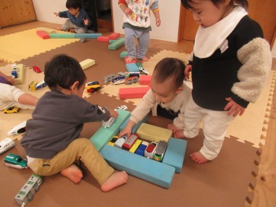 ソフトブロックで道路や橋を作り、上を走らせたり、電車を連結させたりして存分に車遊びを楽しみました♫