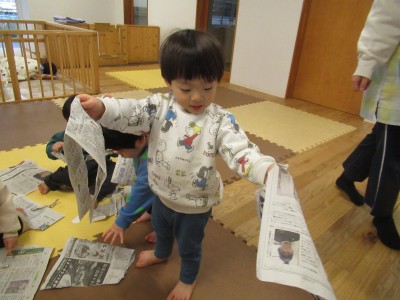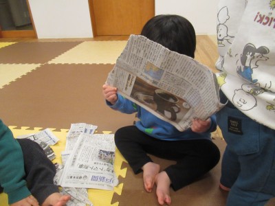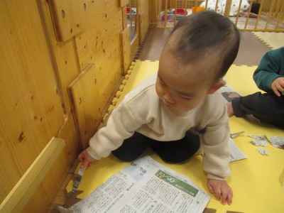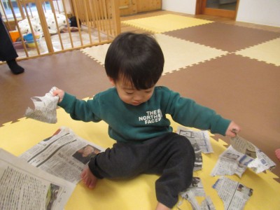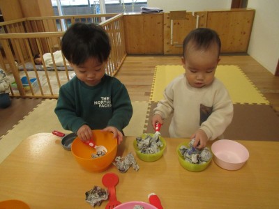 0歳児クラス今日は明日の節分に使う豆を新聞紙で作りました♫