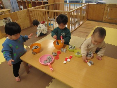 完成すると「おには~そと!ふくは~うち!」とみんなで言いながら豆を投げて鬼退治の練習をしたり、おままごとで見立て遊びを楽しんだりしました(*^^*)