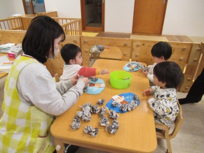 0歳児クラスおさるさんの顔を描いたり、新聞紙を丸めて貼り付けたりして2月の製作が完成しました✨
