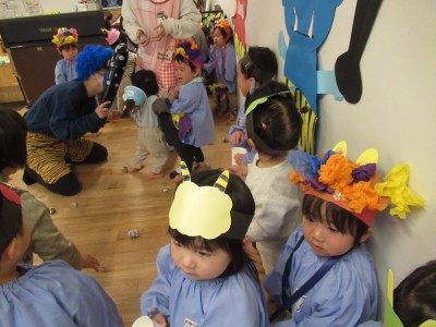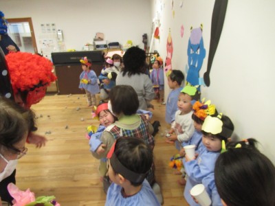 鬼さん見て「キャー!!」「怖い!!」と言い泣いてしまうお友達の中でも「鬼は外!!」「鬼は外!!!」としっかり豆まきができたお友達もいました(^^♪