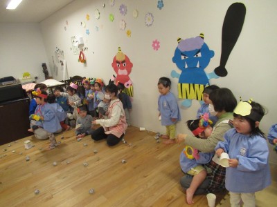 お部屋の壁に、大きな鬼さん登場!!まず、お壁の鬼さんに「鬼は外!」「福は内!」