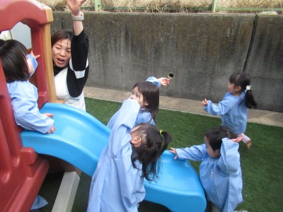 すべり台では、「カンカンカン!」「ゴー」と踏切ごっこを楽しんだよ!