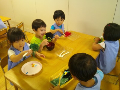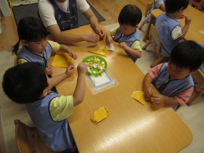 2歳児クラスひまわり作りの完成に向けて製作をしました!