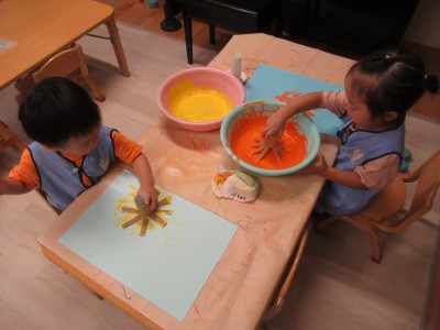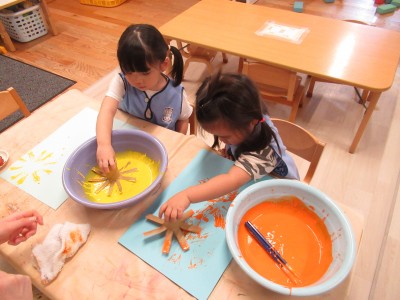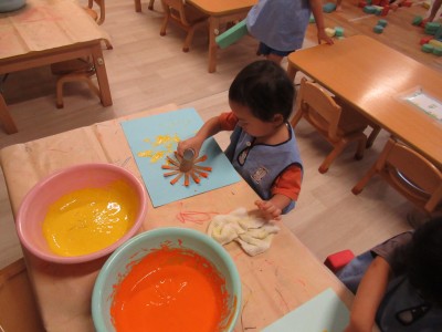 手に絵の具を塗ると、くすぐったそうにしながらも「どうなるかな?」と楽しみにスタンプをしていました!