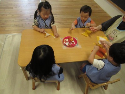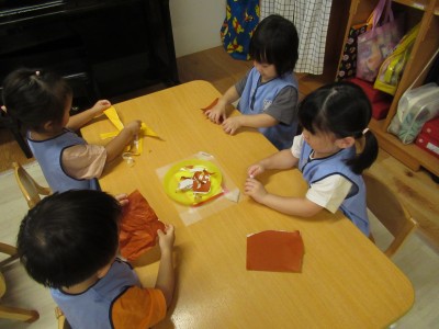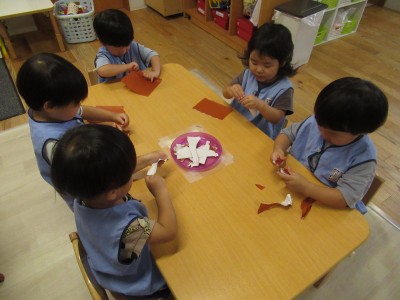 なかなかちぎれない色紙に苦戦しながらも、徐々にコツを掴んで小さくなるまで頑張りました☆