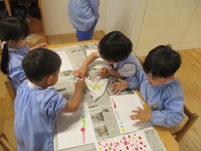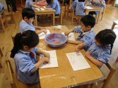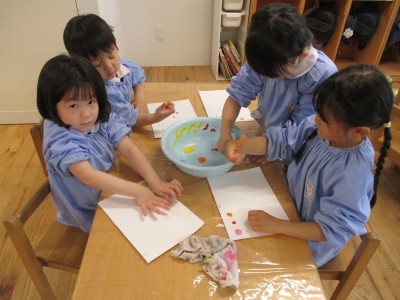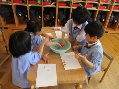 5歳児クラス4月の月刊絵本「しもんのぎもん」を毎日読んでいると子どもたちから「しもんみてみたい!」と声が上がり、絵具で指スタンプをして指紋を観察してみました(*^^*)