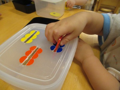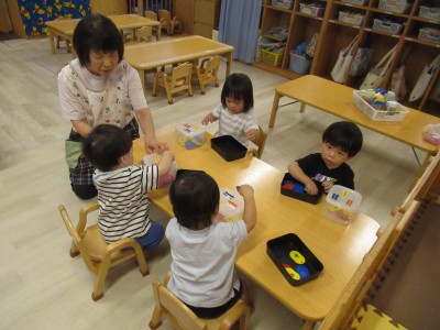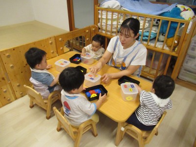 0歳児クラス今日はお部屋でポットン落としやメダル落としなどの指先遊びを楽しみました(*^^*)