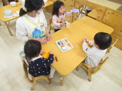 クレパスの色にこだわりながらダイナミックにお絵描きを楽しんだり、はみ出さないように丁寧に描き進めたり等様々な子どもの姿が見られました。