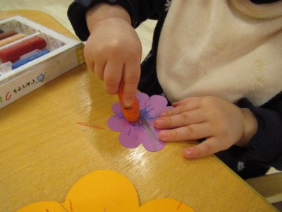 0歳児クラスお花型の画用紙にお絵描きをしたり、シールを貼ったりしました♪