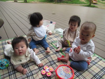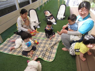 0歳児クラス外の気持ち良い風にあたりながら好きなおもちゃで遊びました☆