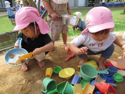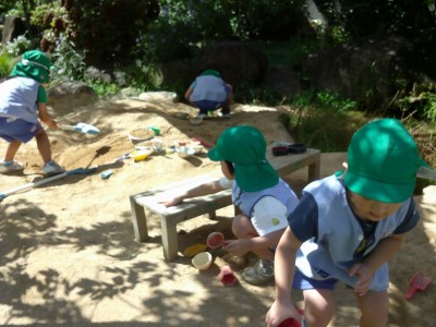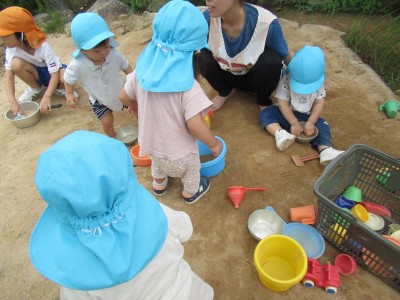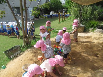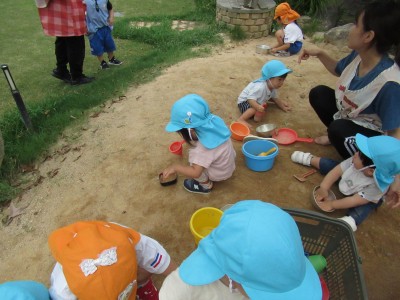 お砂場ではスコップでお皿に砂や葉っぱを入れて混ぜてみたり、出来上がったごはんを「どうぞ♪」と先生に渡してくれたり…(^^♪