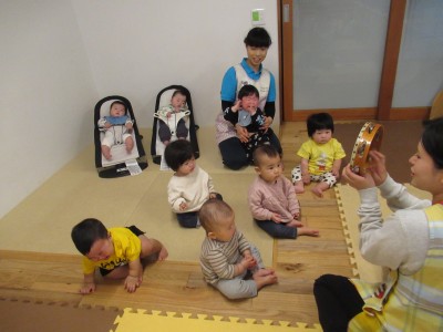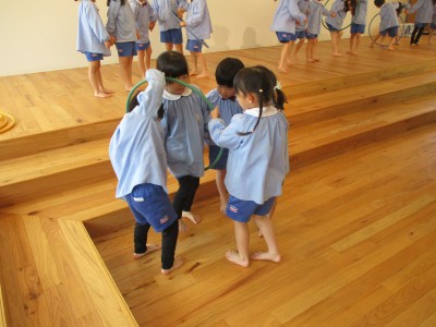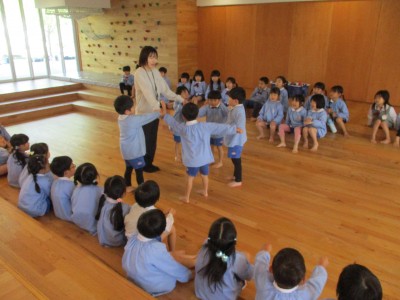 午前中はあいにくの雨だったのでお部屋でリトミックとひっつきもっつきをしました!