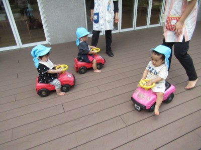 0歳児クラス今日は園庭でコンビカーに乗ったり、砂場で遊んだりしました。