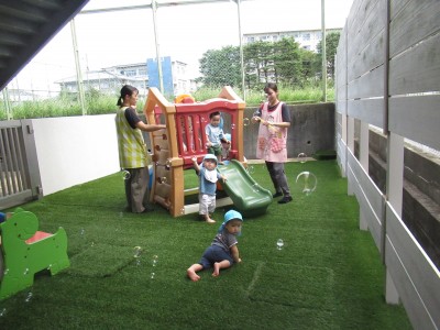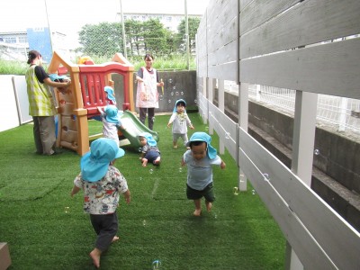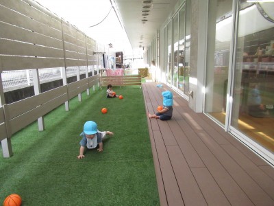 0歳児クラス今日はテラスでボールで遊んだり、シャボン玉をしたり、滑り台をしたりと存分に戸外で遊びました(*^^*)